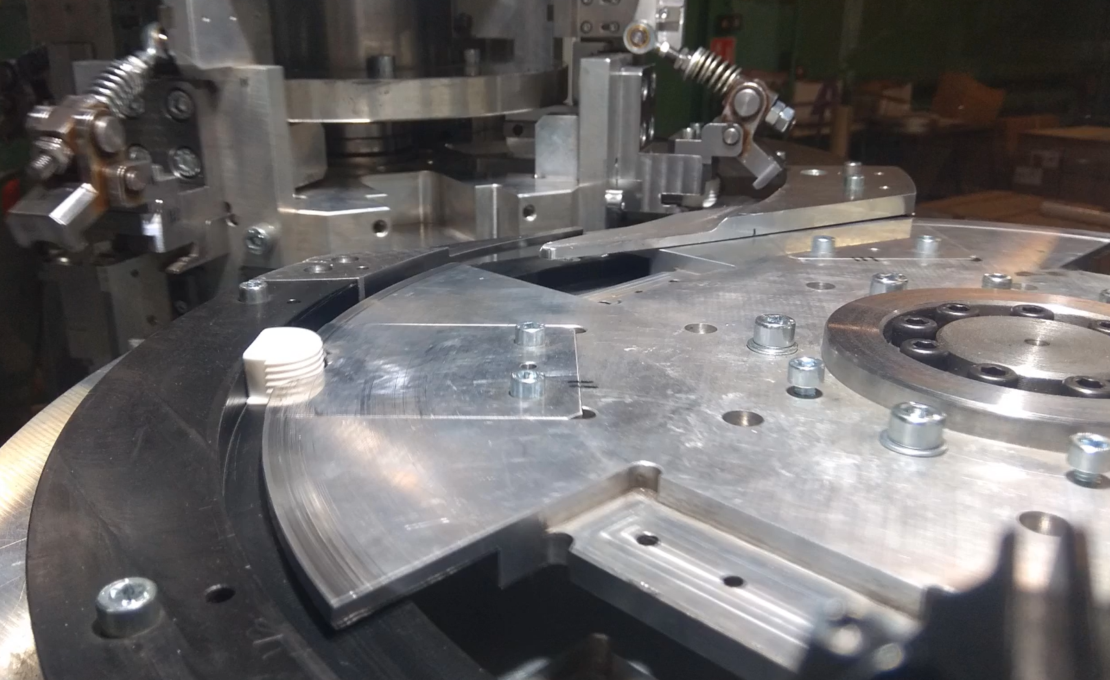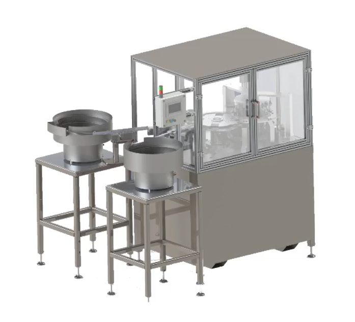 Automat montażowy łączy ze sobą dwa różne elementy z wydajnością 24 szt./min. Automat posiada podajniki wibracyjne które podają odpowiednio spozycjonowane elementy do dwóch kół montażowych. Pierwsze koło zabiera elementy z podajników wibracyjnych do gniazd formujących w drugim kole. Gniazda formujące na drugim kole zaciskają elementy ze sobą a następnie wyrzucane gotowe produkty do pojemnika.