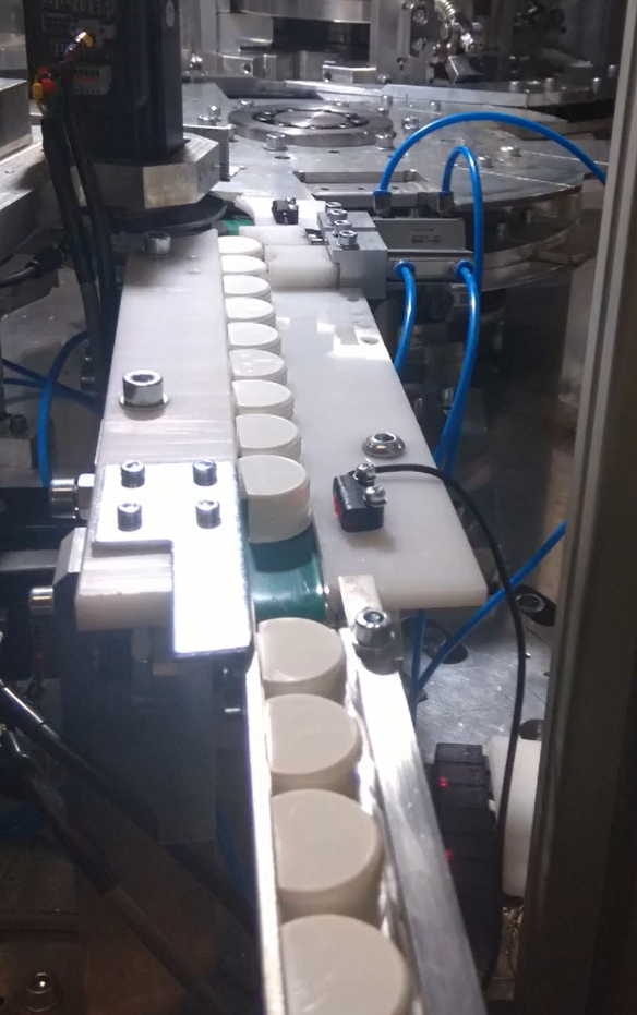 Automat montażowy łączy ze sobą dwa różne elementy z wydajnością 24 szt./min. Automat posiada podajniki wibracyjne które podają odpowiednio spozycjonowane elementy do dwóch kół montażowych. Pierwsze koło zabiera elementy z podajników wibracyjnych do gniazd formujących w drugim kole. Gniazda formujące na drugim kole zaciskają elementy ze sobą a następnie wyrzucane gotowe produkty do pojemnika.
